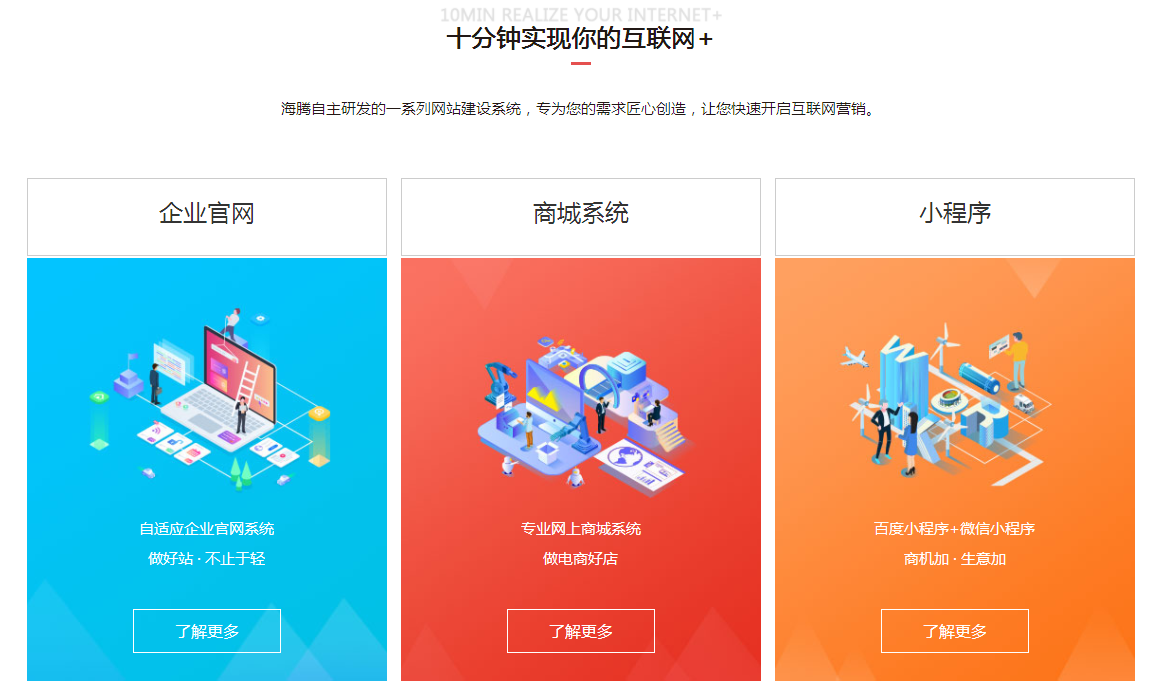 企業(yè)的線上運(yùn)營離不開網(wǎng)站平臺的支撐,網(wǎng)站不僅是企業(yè)形象和實(shí)力的展示,同時(shí)也是用戶了解以及開通產(chǎn)品的入口。海騰數(shù)據(jù)針對中小企業(yè)開發(fā)網(wǎng)站周期長,成本高,管理困難等特點(diǎn),特推出企業(yè)官網(wǎng)和電商類網(wǎng)站的“云端智能建站系統(tǒng)”。該系統(tǒng)使用最新H5響應(yīng)式技術(shù),前端頁面可在電腦端、手機(jī)端、平板端自適應(yīng)顯示,后臺功能也可隨系統(tǒng)的升級而適應(yīng)更新?梢暬翱诰庉嫷墓δ,使得網(wǎng)站管理不再麻煩,只要懂得電腦的基礎(chǔ)操作,即可管理維護(hù)網(wǎng)站。一鍵切換主題風(fēng)格的功能,可讓網(wǎng)站在各種節(jié)假日以及各種季節(jié)隨時(shí)換裝,真正的實(shí)現(xiàn)一個網(wǎng)站百種風(fēng)格的效果。而超強(qiáng)的SEO系統(tǒng),通過合理的網(wǎng)站布局,分頁描述,關(guān)鍵詞優(yōu)化等,讓網(wǎng)站收錄變的更加簡單。對于大多數(shù)零售,酒店,快餐等行業(yè),微信小程序可以快速將你的業(yè)務(wù)搬到線上,用戶只需通過掃碼或搜索附近小程序的功能,即可快速方便的開通產(chǎn)品,線上合作。