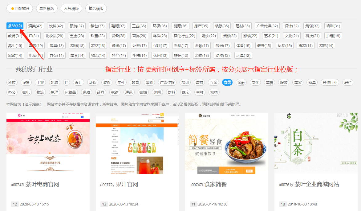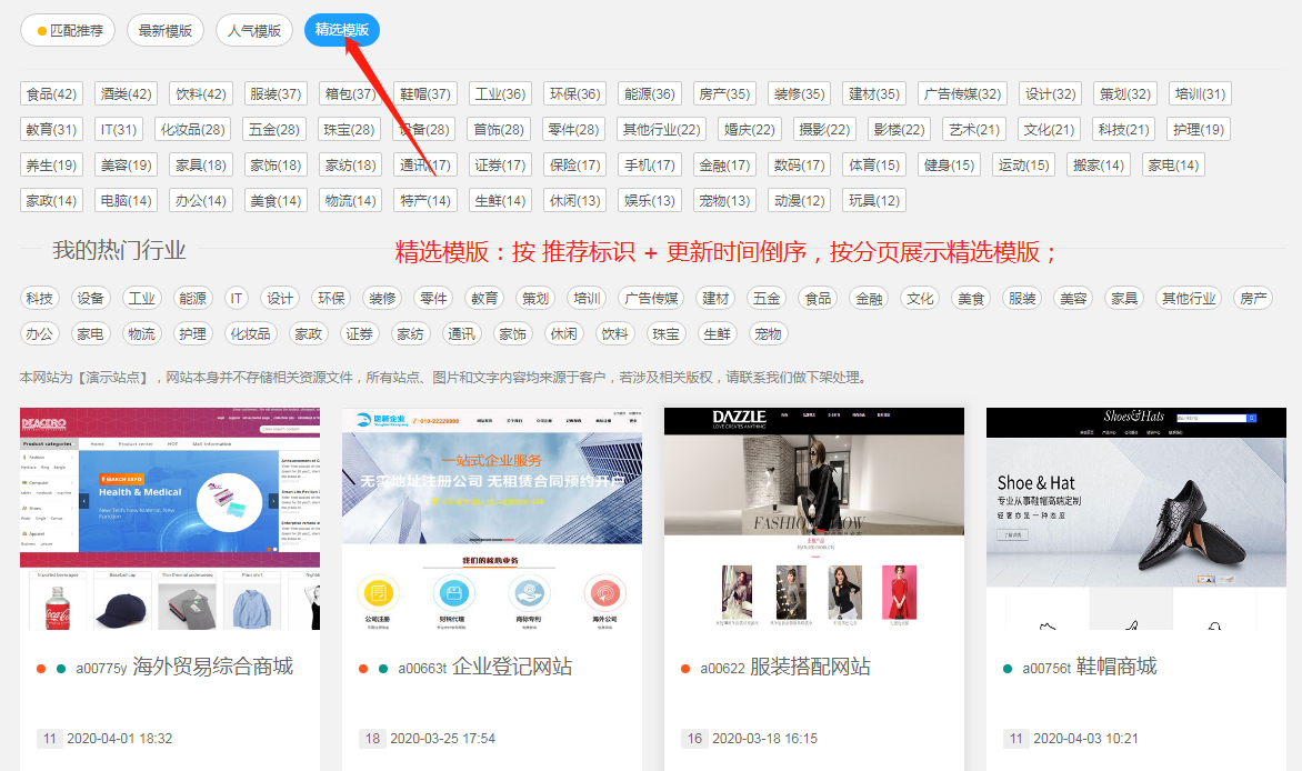我的熱門行業(yè):顯示當(dāng)前代理站點與模版交集特征集,按行業(yè)名方式呈現(xiàn);