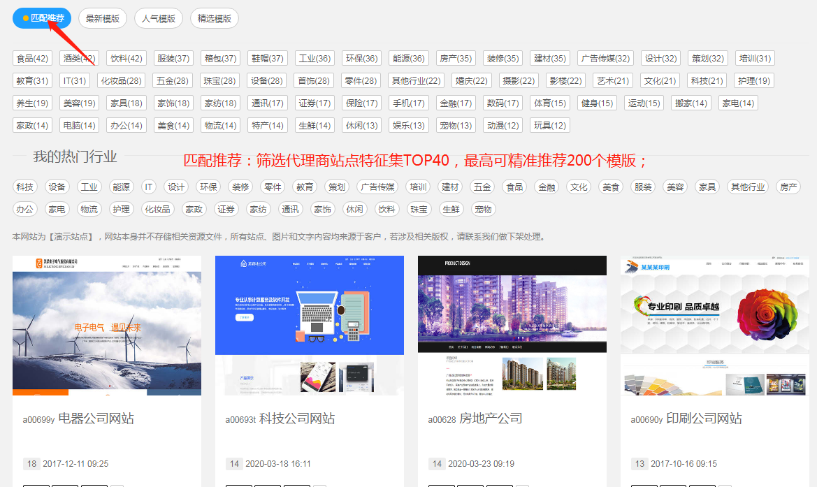 匹配推薦:篩選代理商站點特征集TOP40,最高可推薦500個模版;