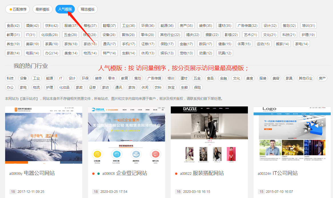 人氣模版:按 訪問量倒序,按分頁展示訪問量最高模版;