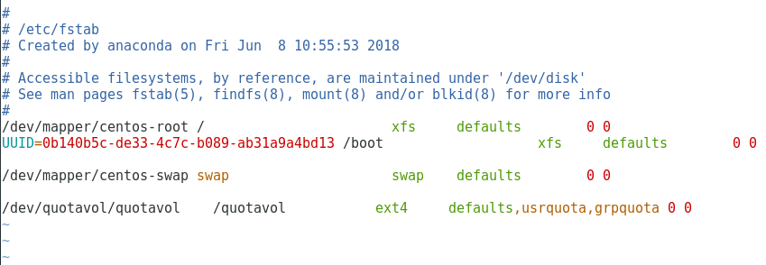 1 :修改/etc/fstab 設(shè)置quotavol分區(qū)支持磁盤配額功能