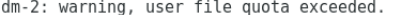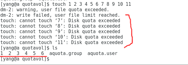 由于沒(méi)有超出最大文件數(shù)量的限制,所以可以成功創(chuàng)建6個(gè)文件。 在創(chuàng)建第6個(gè)文件的時(shí)候,提示limit reached 意思是限制已經(jīng)達(dá)到。在創(chuàng)建第7個(gè)文件的時(shí)候,提示磁盤配額超標(biāo),不讓再創(chuàng)建任何文件了。