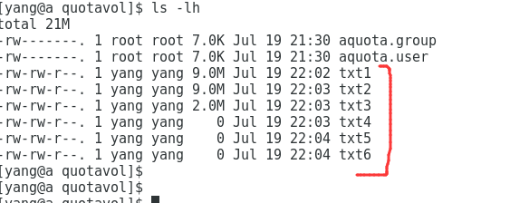 這里設(shè)定用戶quota最大使用容量為20M,當(dāng)使用到10M時(shí)會(huì)得到警告要求降低到10M,最多可以創(chuàng)建6個(gè)文件,當(dāng)創(chuàng)建5個(gè)文件時(shí)會(huì)得到警告要求降低到5個(gè)文件。