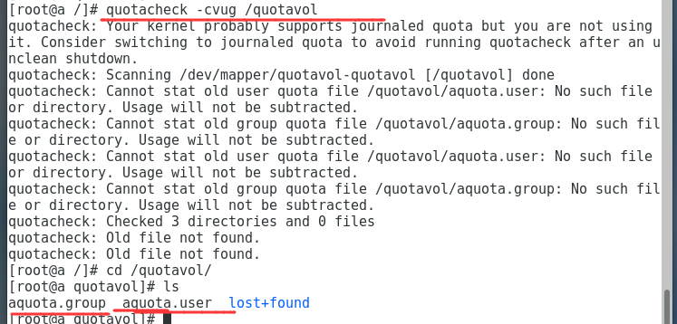 2:通過(guò)quotacheck –cugm命令在/quotavol目錄下生成磁盤配額的配置文件