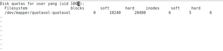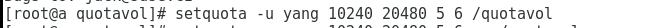# setquota -u yang 10240 20480 5 6 /quotavol