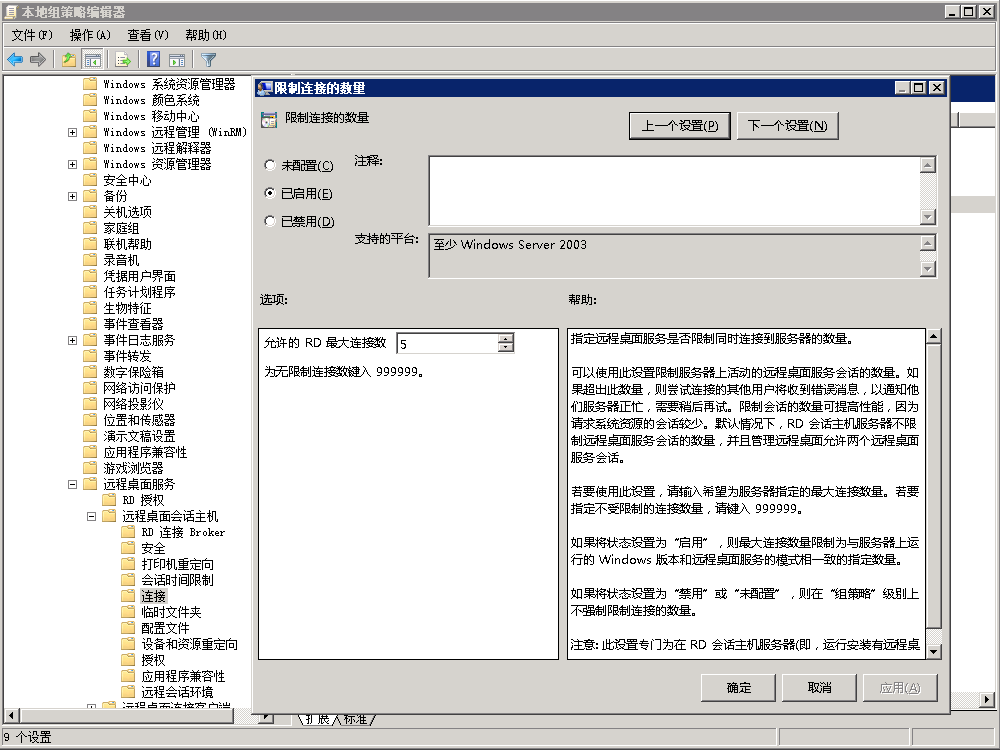 3) 雙擊“限制連接的數(shù)量”,在彈出的窗口中輸入最大連接數(shù),并選擇“已啟用”。