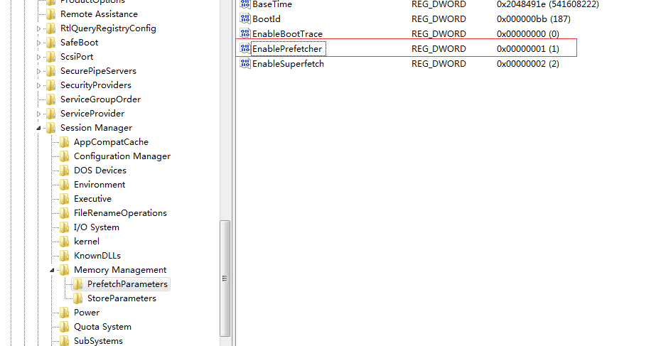 HKEY_LOCAL_MACHINE\SYSTEM\CurrentControlSet\Control\SessionManager\Memory Management\PrefetchParameters 在右邊找到EnablePrefetcher主鍵,把它的默認值3改為1,這樣滾動條滾動的時間就會減少。