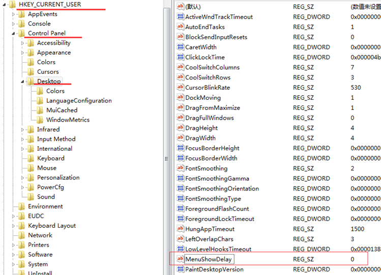 HKEY_CURRENT_USER\Control Panel\Desktop下找到“MenuShowDelay”主鍵,把它的值改為“0”就可以達到加快菜單顯示速度的效果。
