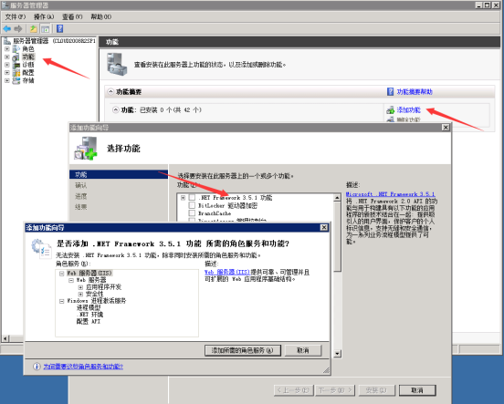 2.打開服務(wù)器管理器后,選擇功能 → 添加功能。在添加功能向?qū)е泄催x“ .NET Framework 3.5.1 功能”,添加所需的角色服務(wù),并選擇下一步。