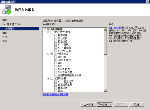 4.在角色服務(wù)中勾選需要安裝的功能。(“常見HTTP功能”,全部勾選。“應(yīng)用程序開發(fā)”,全部勾選!敖】岛驮\斷”,可以只勾選默認(rèn)的也可以全部勾選!鞍踩浴保梢灾还催x默認(rèn)的也可以全部勾選!靶阅堋保抗催x!肮芾砉ぞ摺保梢灾还催x默認(rèn)的也可以全部勾選!癐IS6 管理兼容性”,全部勾選!癋TP服務(wù)器”,需要使用全部勾選,注意會和其他FTP沖突!癐IS可承載 Web 核心”,全部勾選)。