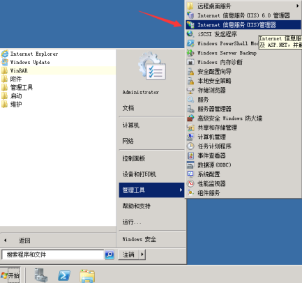 8.安裝完畢IIS管理器后準(zhǔn)備開始搭建網(wǎng)站,點擊“開始菜單” → “管理工具” → “Internet 信息服務(wù)(IIS)管理器”。