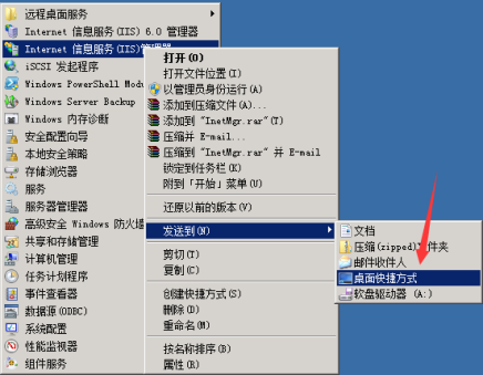 9.右鍵選擇“Internet 信息服務(wù)(IIS)管理器”,選擇 “發(fā)送到” → “桌面快捷方式”。方便下次對網(wǎng)站站點操作。