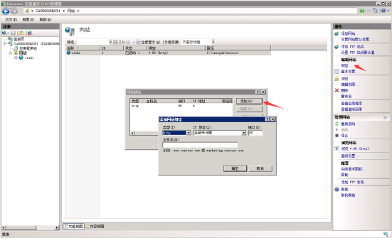 16.綁定域名:找到左邊菜單欄綁定點擊打開,彈出綁定域名窗口。點擊添加并在主機(jī)名地址填寫需要綁定的地址,確定并完成綁定。