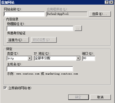12.在添加網(wǎng)站窗口中填寫所需要創(chuàng)建的網(wǎng)站站點信息(網(wǎng)站名稱,可以隨意填寫,可以和網(wǎng)站文件夾名稱一致方便管理。物理路徑,選擇至搭建網(wǎng)站站點的文件夾目錄,需要選擇到一級目錄。類型,選擇網(wǎng)站站點類型。IP 地址,選擇需要綁定的IP,可以不分配。端口,填寫需要設(shè)置的端口,默認(rèn)為80。主機(jī)名,填寫所需要綁定的網(wǎng)站站點域名,可以空置在搭建完畢后再綁定。),設(shè)置完畢后點擊確定創(chuàng)建網(wǎng)站站點。