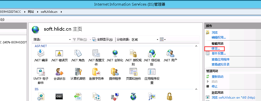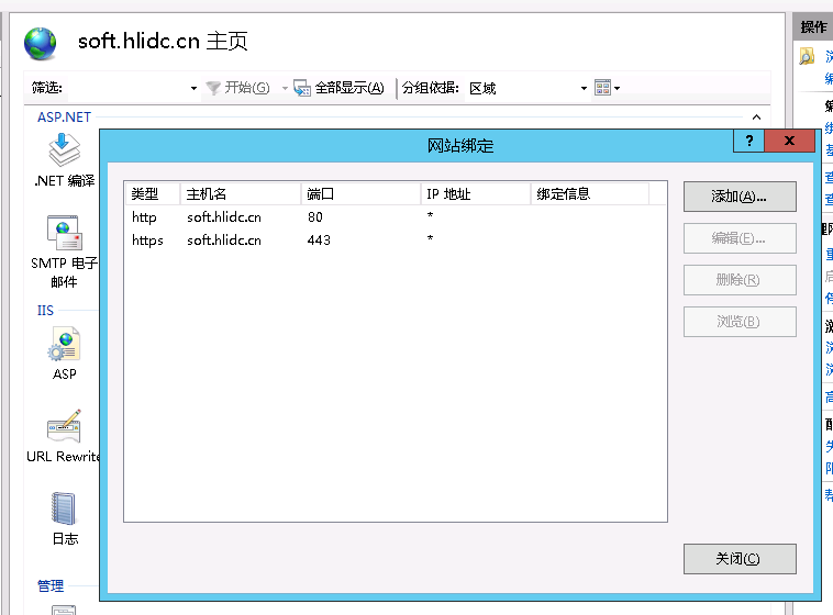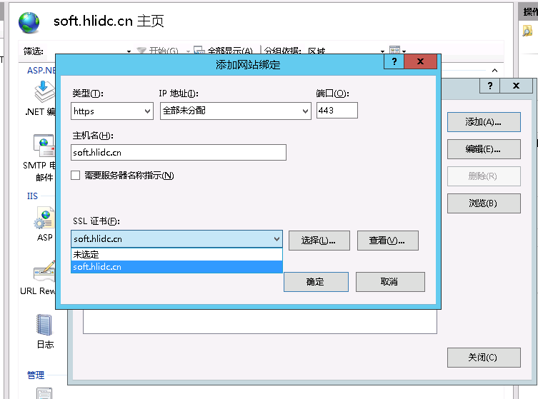 添加添加—— 類型 下拉勾選https , 主機名稱填寫站點的二級域名 如 soft.hlidc.cn , SSL 證書下拉勾選“soft.hlidc.cn”這個證書文件。