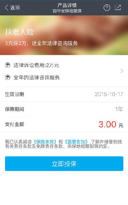 日前,支付寶悄然在“我的保障”中新增了一個扶老人險,只需支付3元就能享受一年期的“扶老人險”,期間最高可獲得2萬元的法律訴訟費(fèi)用,并提供全年的法律咨詢服務(wù)。