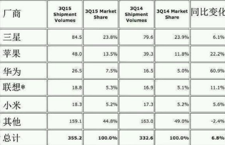 除了上述五大公司之外,全球其它智能手機制造商在今年第三季度的智能手機市場上的總出貨量同比下滑2.4%,大約達到1.591億部,約占整個市場44.8%的份額,而去年同期的出貨量則為1.63億部,約占當時季度全球市場49%的份額。
